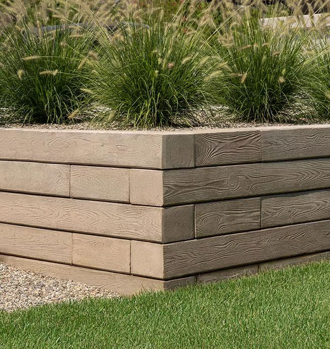 The Borealis retaining wall replicates the rustic wood garden wall look in a maintenance-free, more durable concrete option. Inspired by the use of railroad ties in both traditional and modern landscape design, the Borealis wall’s versatility extends from simple edging for flowerbeds all the way to the creation of garden walls and outdoor kitchens.