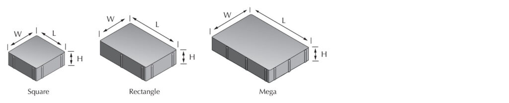 | Mega | 8.19″ x 10.94″ x 2.375″ | 19 lbs. | 160 | 102 | 3,040 lbs. |
